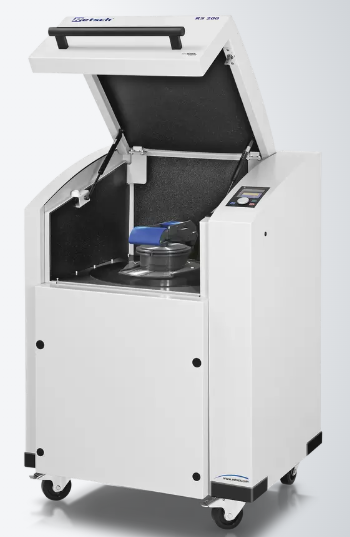 3. RS200及其研磨裝置的操作和處理非常方便,符合人體工程學。研磨罐配備有移動手柄,便于將沉重的研磨罐運送到研磨儀上,在導軌上滑入研磨站.安全緊固裝置可以用較小的力量安全地固定研磨罐;傳感器檢查其正確位置。